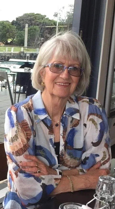 An elderly woman with short gray hair and glasses, wearing a colorful blouse with blue, brown, and white patterns, sitting indoors near a large window with an outdoor view of trees and a boat dock.